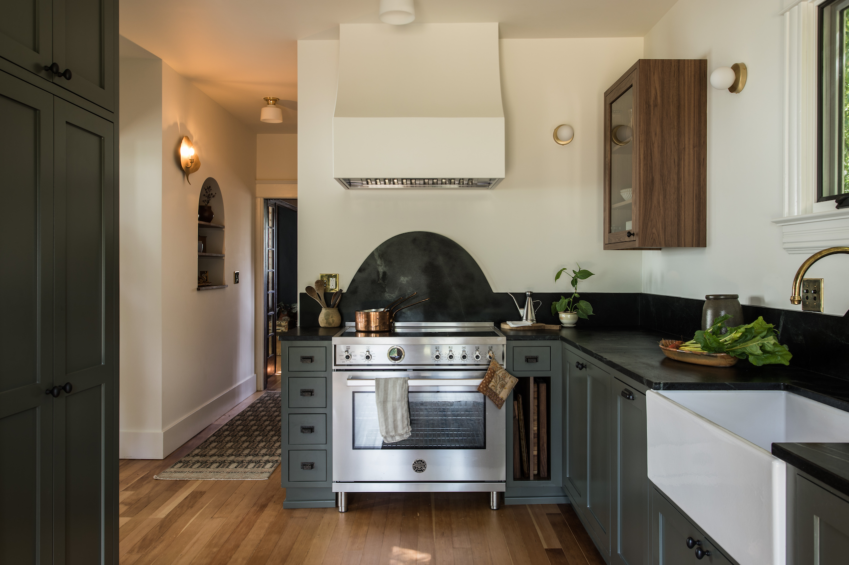 A cramped and dated 1970s kitchen in this historic home was reimagined as a richly hued, modern space with a hint of drama. The u-shaped kitchen walls, as well as the walls between the kitchen and dining room, were all removed to create a galley kitchen with greater natural light and a better connection to the rest of the living space. Views of the Willamette River are now visible from the entire first floor.